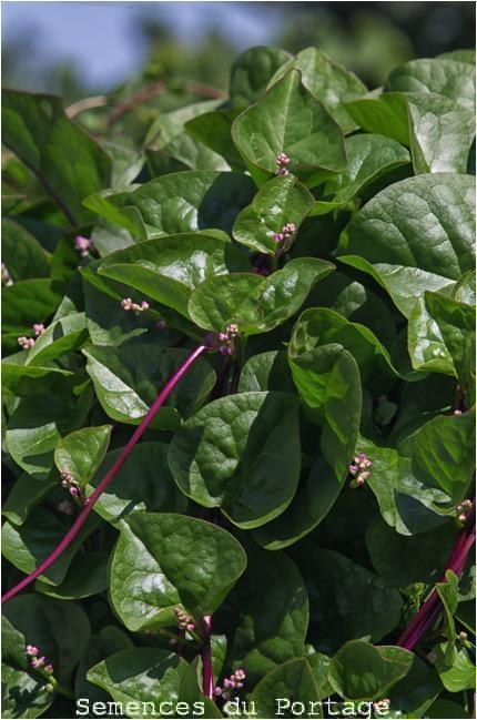 D'origine Indienne, l'épinard de Malabar tolère la chaleur mais craint le gel. Plante tropicale grimpante, très ornementale. Les feuilles mucilagineuses peuvent être consommées crues ou cuites, parfois utilisées pour remplacer l'okra afin d'épaissir soupes et ragoûts. Le jus des fruits peut être utilisé comme encre ou colorant alimentaire ou teinture rouge-violette. Produit en continu jusqu'au gel. Cultivar grimpant. H : 2 m.