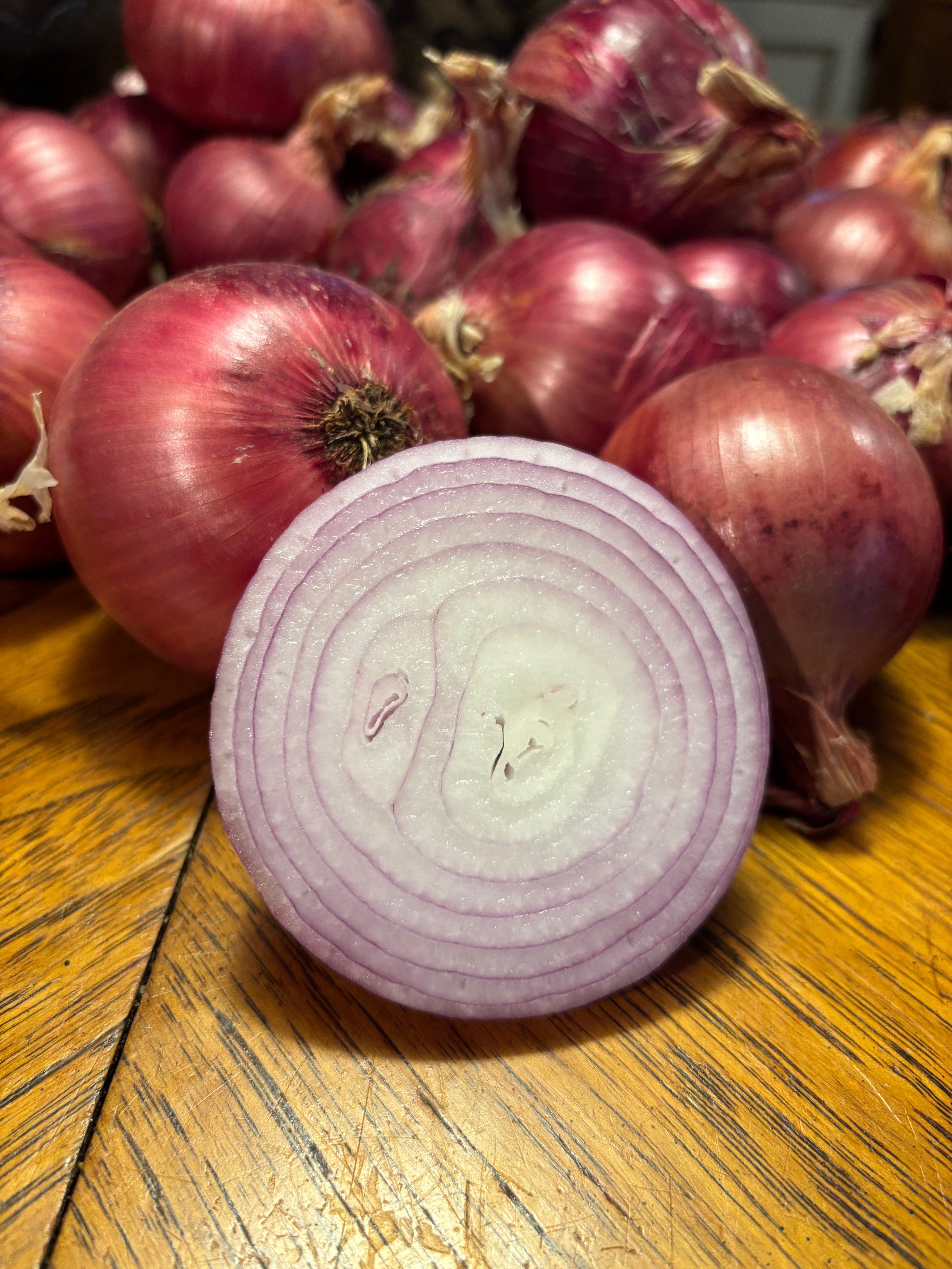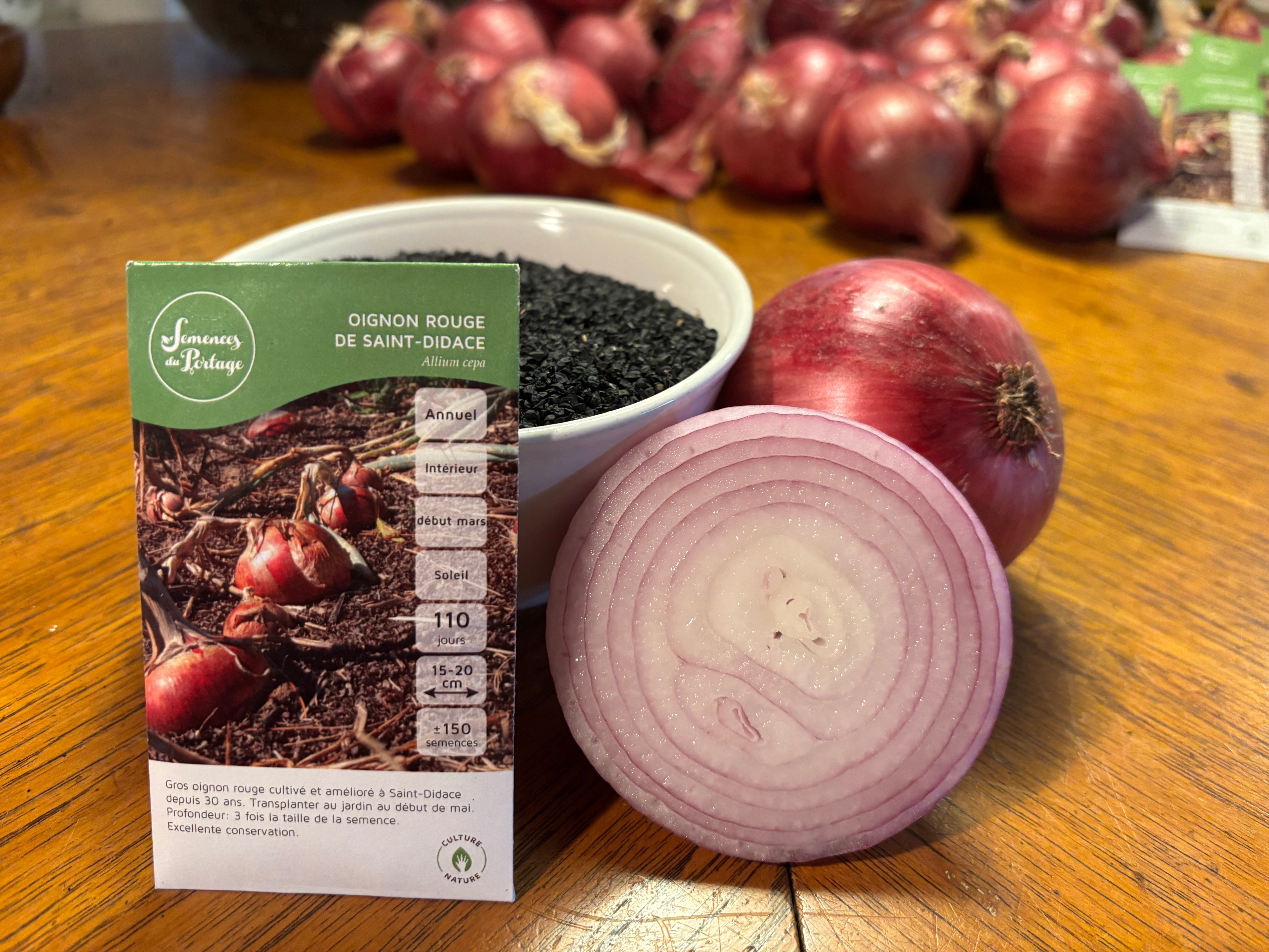 Minutieusement sélectionné par Yves Gagnon depuis plus de 40 années à partir de l'oignon Red Man (discontinué), cet oignon rouge de forte taille s'est merveilleusement adapté aux conditions de la vallée de la rivière Maskinongé. Produit en zone 4b, le bulbe qui se conserve facilement 8 mois se prête autant à la cuisson qu'à une utilisation crue. Il a été baptisé Rouge de Saint-Didace par celui qui lui a conféré ses nouveaux caractères. Patrimoine québécois.