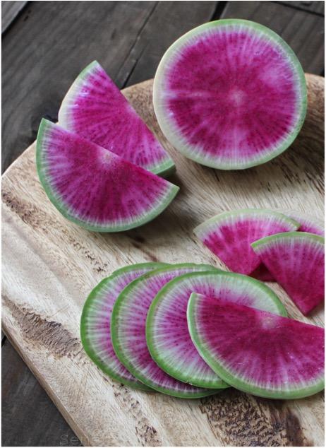 Blanc avec un coeur fuchsia, croustillant et légèrement piquant, le radis melon d'eau se mange frais ou cuit. Récolte d'automne à 6 à 8 cm de diamètre. Bonne conservation.
